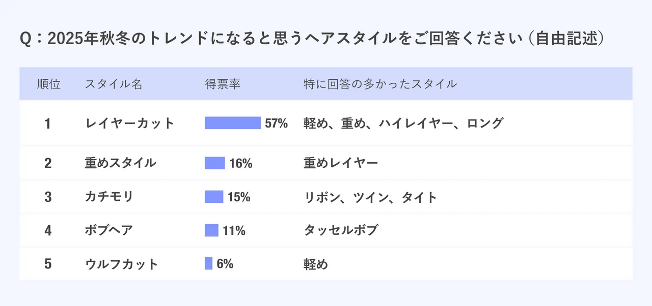 第1位は、レイヤースタイルでした。2025年春夏トレンドヘアスタイル調査でも1位だったレイヤースタイルは、まだまだ人気継続の様子。
