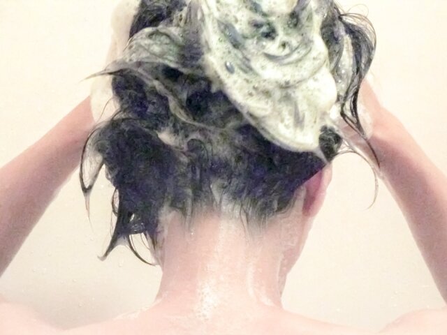 1. 予洗い: ぬるま湯で、頭皮と髪を1〜2分かけてしっかりすすぐこと。